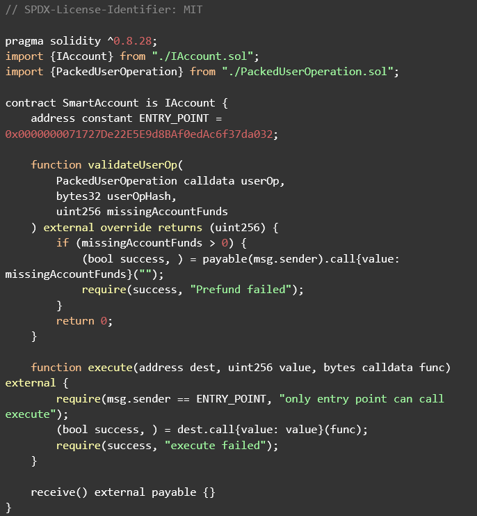 - execute() — Allows the EntryPoint to instruct the smart account to send ETH or make contract calls to any destination. This is how the account actually performs actions on-chain once validated.
