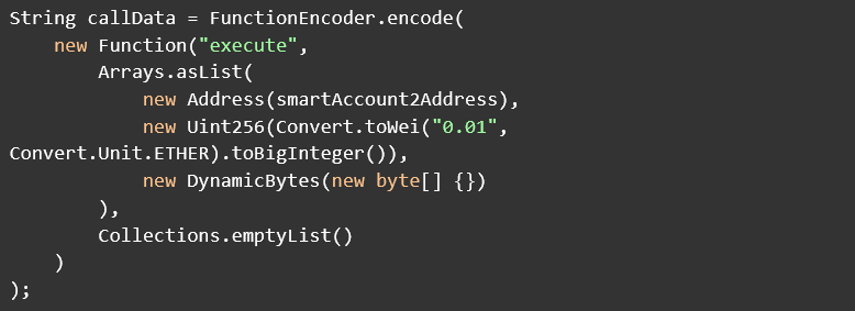 Let’s try to send some ETH between the two accounts we have deployed. We are using the execute() function, so first we need to encode it: