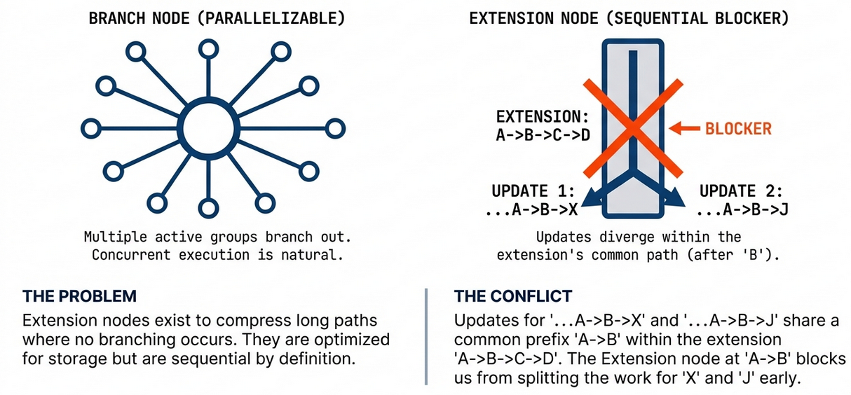 Merkle Patricia Tries use extension nodes to compress sequential path segments, optimizing storage space. However, these nodes create serialization bottlenecks in Besu because updates require decompressing the shared path, applying changes iteratively, and rebuilding the extension node. We optimized this by parallelizing the update logic: instead of processing updates serially through the compressed path, we decompress the full path, apply all updates concurrently to the underlying nodes, and then reconstruct the extension node if needed.