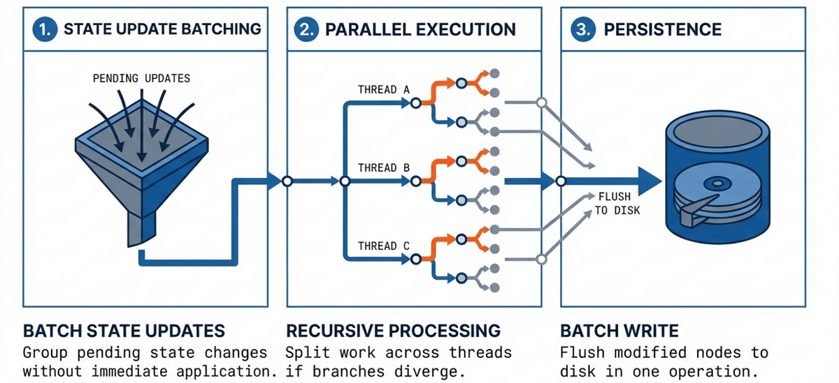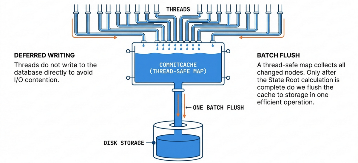 - Batch-Optimized Persistence: To prevent I/O bottlenecks from undermining parallel processing gains, Besu employs a commit cache mechanism. Worker threads deposit their computed node updates into this shared buffer rather than writing directly to RocksDB. After Root Hash calculation completes, the system executes a single bulk write operation to RocksDB, minimizing disk contention and maximizing write throughput.