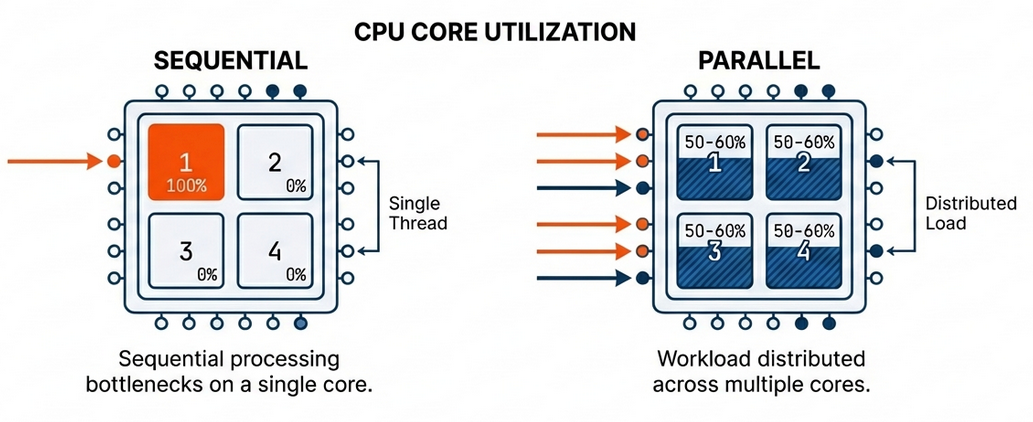 Adaptive Parallelization spreads the work across multiple threads, taking full advantage of multi-core systems.