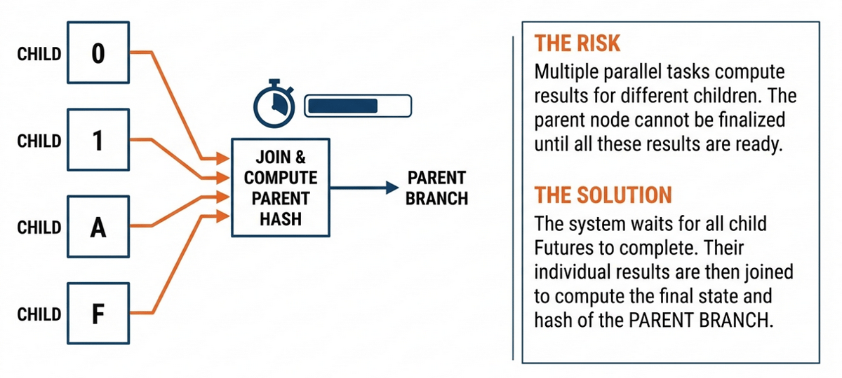 - Future-based Synchronization: Besu spawns child Tasks (Java CompletableFuture objects) for each parallel subtree operation. The parent branch hash calculation waits until all child tasks (covering nibbles 0-F) complete and return their results (Divide and Conquer algorithm).