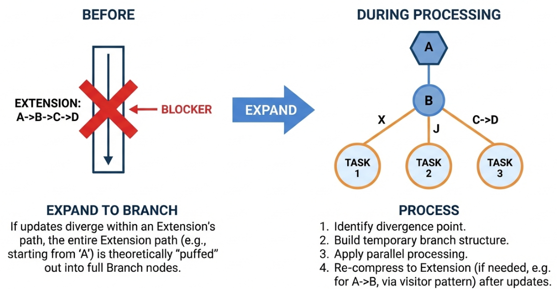 - Temporary Expansion: The Extension node is temporarily converted into a proper branch structure, creating separate child paths for conflicting updates.