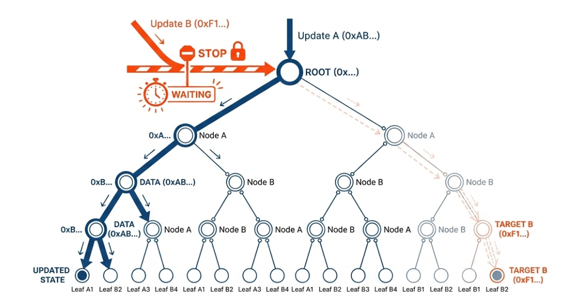 The same approach handles leaf nodes and empty slots. A leaf in the trie can only have one update path passing through it. When multiple concurrent updates target the same leaf or empty position, they all converge at that node, creating a bottleneck.
