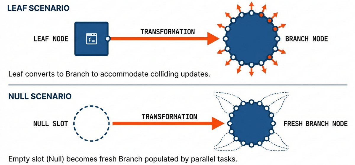 Enabling parallelization: To process concurrent changes at this level, we preemptively convert leaf nodes into branches before they become bottlenecks. This transformation maintains pipeline flow by ensuring that leaf-to-branch conversions don't block concurrent updates to the newly created child nodes.