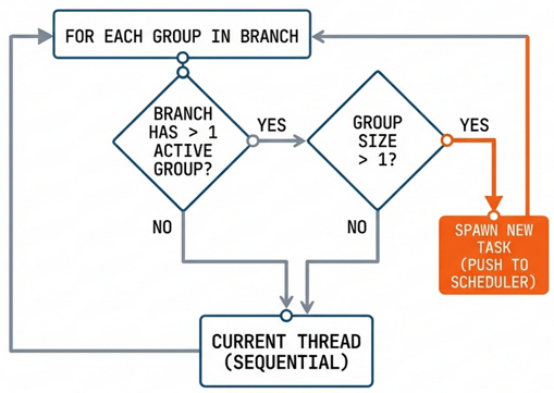 When both criteria are satisfied, the function dispatches subtree processing to the scheduler. This evaluation occurs recursively at each trie level, enabling adaptive parallelism based on data distribution: dense subtrees with many modifications spawn additional tasks, while sparse areas continue processing on the current thread to avoid unnecessary overhead.