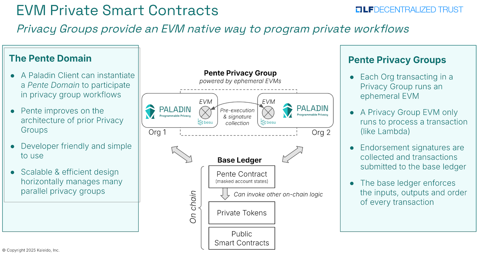 Paladin comes with a built-in implementation of EVM privacy groups called Pente. This represents the very latest generation of EVM privacy group technology, a significant evolution beyond what was previously available in Tessera.