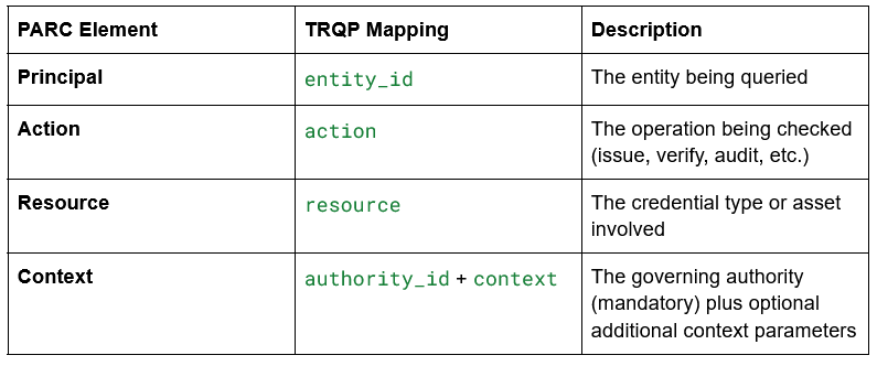 The TRQP information model is inspired by the PARC model (Principal, Action, Resource, Context), a well-established framework for expressing authorization decisions: